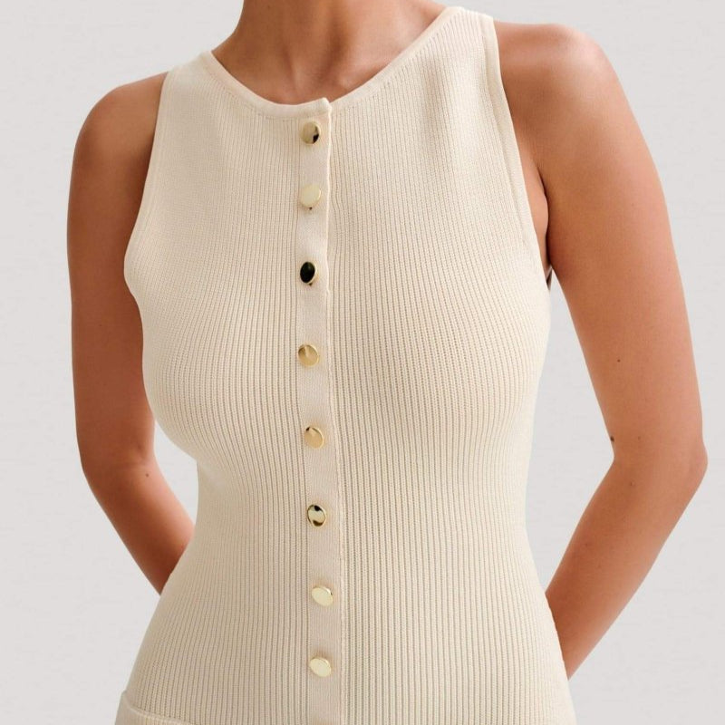 Deze mouwloze knoopjurk met zakken straalt ingetogen klasse en moderne elegantie uit. Het aansluitende silhouet volgt op sierlijke wijze de natuurlijke lijnen van het lichaam en creëert een verfijnde, vrouwelijke uitstraling. De jurk is voorzien van een rij decoratieve knopen over de gehele lengte, die niet alleen zorgen voor een stijlvol gegevens maar ook de verticale lijn van het ontwerp versterken, waardoor het silhouet optisch wordt verlengd.