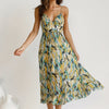 Deze tropische maxi jurk met strikdetail is een speelse en luchtige aanvulling op elke zomergarderobe. Het silhouet is moeiteloos vrouwelijk, met een diep uitgesneden halslijn die overgaat in smalle verstelbare bandjes. De lichte stof zorgt voor een sierlijk vallende rok die soepel beweegt bij elke stap, waardoor deze jurk niet alleen elegant oogt, maar ook zeer comfortabel aanvoelt op warme dagen.