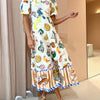 Deze vrolijke midi-jurk is een ode aan zonnige dagen en exotische smaken. De all-over print van tropische vruchten zoals bananen, ananassen, kiwi’s en citrusvruchten geeft de jurk een speelse en kleurrijke uitstraling. De ronde halslijn en de volumineuze pofmouwen zorgen voor een charmant, vintage-geïnspireerd silhouet dat zowel vrouwelijk als gedurfd oogt. De pasvorm is licht getailleerd aan de bovenkant en loopt uit in een zwierige rok die soepel langs het lichaam valt. De contrasterende gestreepte zoom met illustraties van kreeften en zeevruchten geeft de jurk een onverwachte, unieke twist die direct de aandacht trekt.