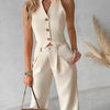 De Vesta- set biedt tijdloze elegantie met een mouwloze top met V-hals en knoopsluiting en een rechte broek. Gemaakt van lichtgewicht, ademend materiaal, perfect voor zowel formele als informele gelegenheden.