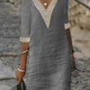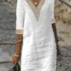 Deze jurk van linnenmix combineert comfort en elegantie en is een veelzijdige aanvulling op je garderobe. De V-hals met delicate kanten rand voegt een vleugje vrouwelijkheid toe, terwijl de relaxte pasvorm en driekwartmouwen zorgen voor bewegingsvrijheid en ademend vermogen.