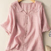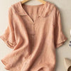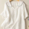 Dames retro overhemd van katoen en linnen met korte mouwen, marineblauwe poppenkraag en dunne stof